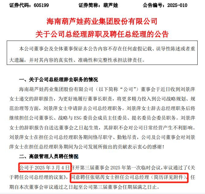 葫芦娃最新公告显示,近日,公司董事会收到张铭芮递交的辞职报告。张铭芮因个人原因,申请辞去公司总经理职务,辞职后不再担任公司任何职务。